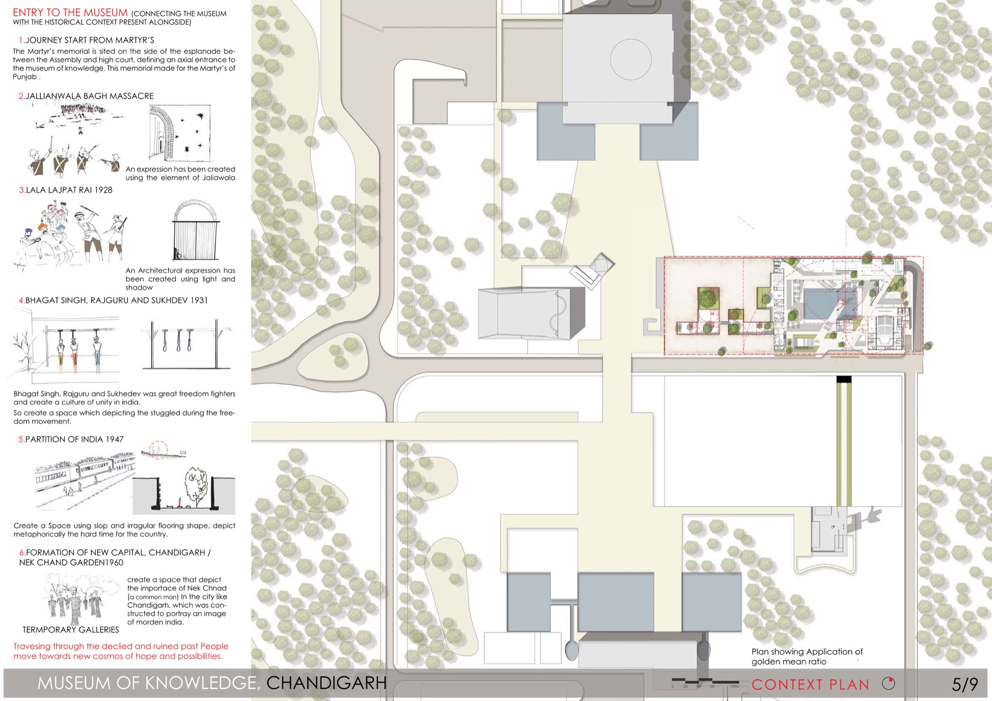 The placement of museum of knowledge has been derived from the axis which connects the assembly and high court building along with the centre point of assembly building forming a golden mean ratio.
