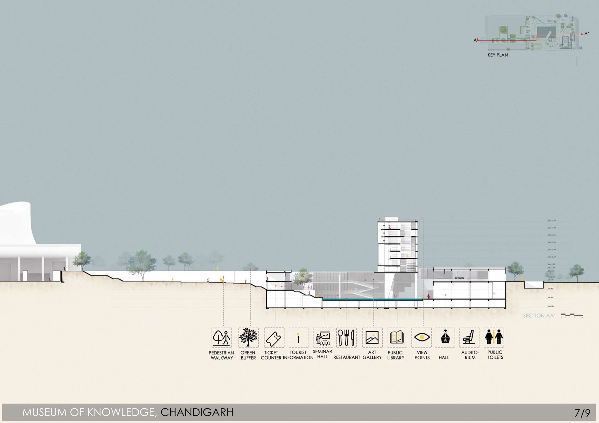 The understanding of what constitutes a Museum of ‘Knowledge’; A city bereft of Le Corbusier’s vision for its thriving centre; The centre in question awaiting reconciliation with the rest of the city. The resulting architectural expression is one uplifting the common public to equal stature as the institutions that stand alongside. A vast, open to all, free flowing space navigating terrain; the circulation reminiscent of ‘pradakshina path’ alluding to the library as a temple of knowledge.