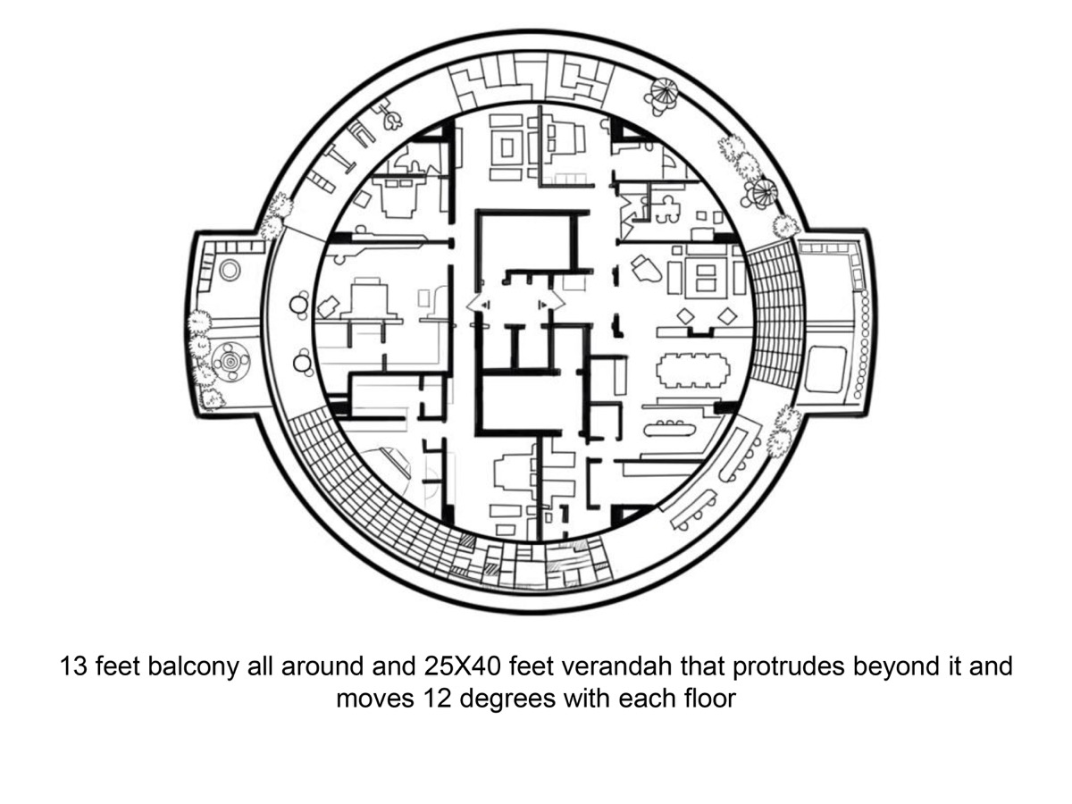 Garden apartments with planters running all along the periphery of the balcony that surrounds the home and a 25 ft. by 40 ft. verandah that protrudes beyond the balcony line allowing fantastic sky views Also this extended verandah staggers helically as we move upwards along the tower creating a bold helical design element that envelopes the tower.