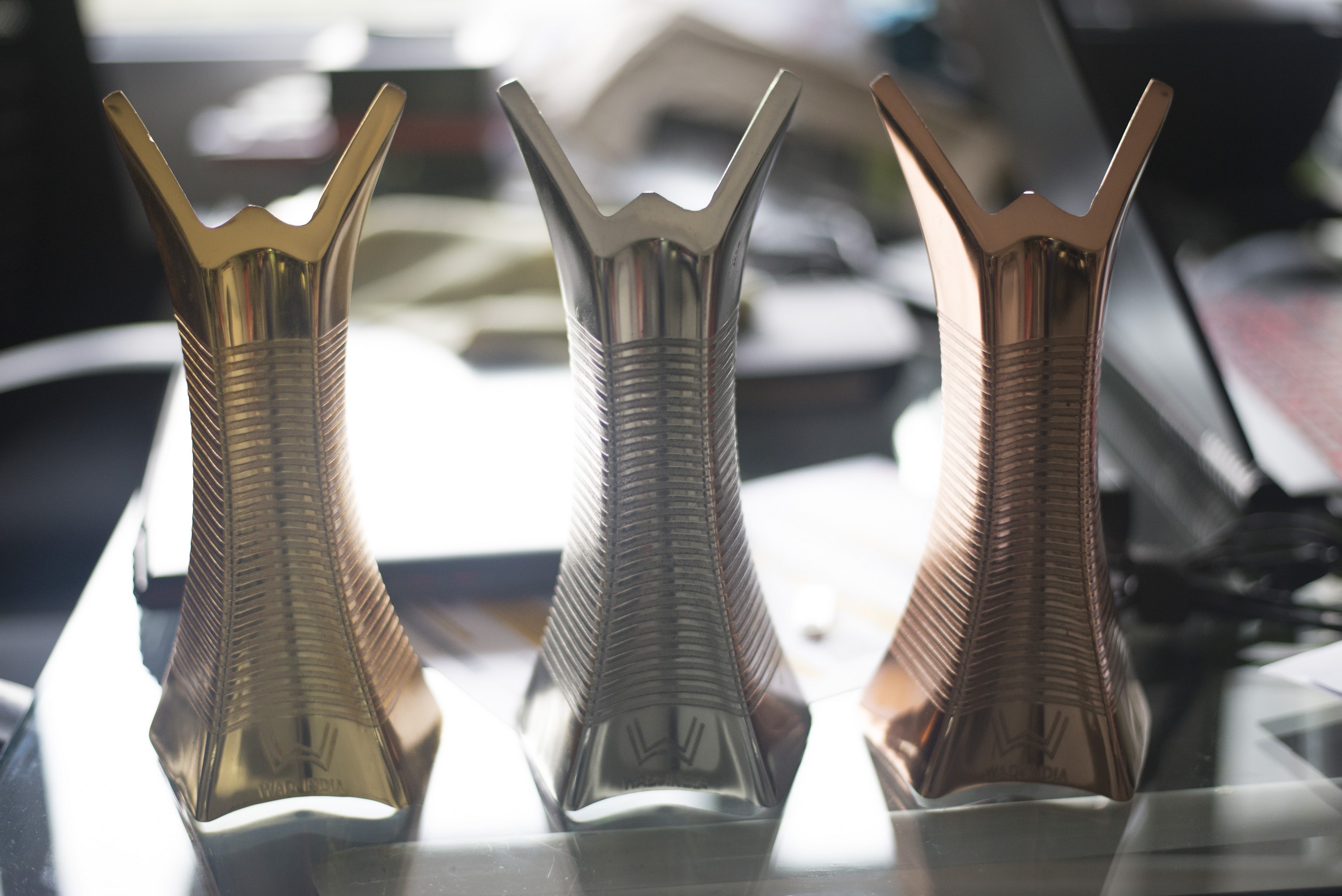 The form is ideated as a fluidic interpretation of the letter ‘W’ that sits as a miniature tower. The cross sections were subjected to parabolic curve to make the design more elegant and mathematically-controlled for fabrication process. The tips were extruded to give the form a triumphant look which was an abstract indication of victory. The trophy was created in three variations in gold, silver, bronze colour to denote hierarchy of merits, as per the brief.