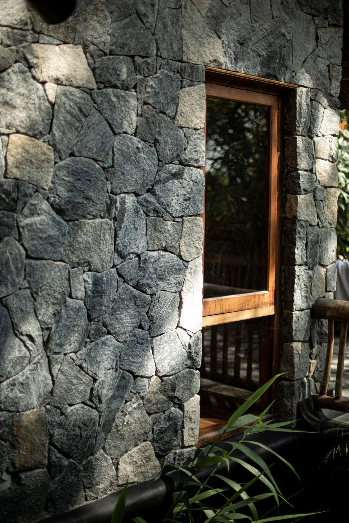 Staying true to our philosophy and keeping up with our eco-friendly ethos, the materials used in the villas are natural, with wooden flooring, random-rubble walls, cobblestone pathways, and log rafters, showcasing a joyous interplay of stone and wood. The wood used in crafting the space portrays its authenticity with ‘Live Edges’ accentuating the natural character of the wood. The floors, joinery, switchboards, skirting and furniture are handcrafted with live edge teak wood that adorns the spaces with warmth and grain. Rough, uncut and unpolished stone each with a character of its own, forms the thick random rubble walls of the lodges. Other natural materials portrayed in Stone Lodges are the clay roof tiles, eucalyptus poles in the ceiling, lapotra granite for counters and stone deck floors.