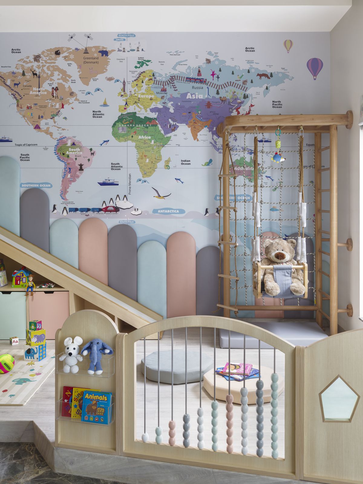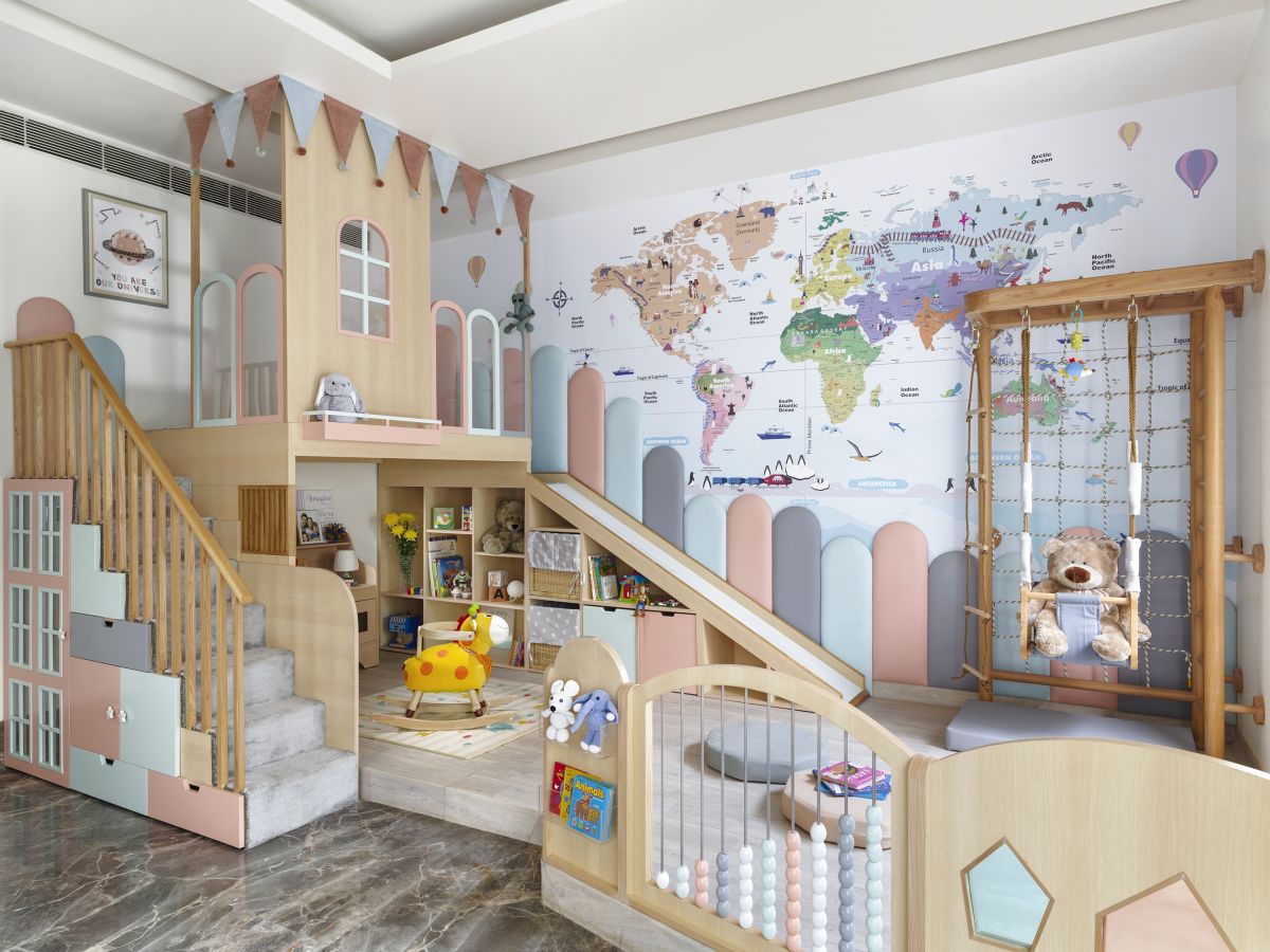 The play area with a slide, a swing and a climbing zone are other elements to release the toddler’s pent-up energy. Under the stairs area has been converted into pull-out storage space for books and toys.